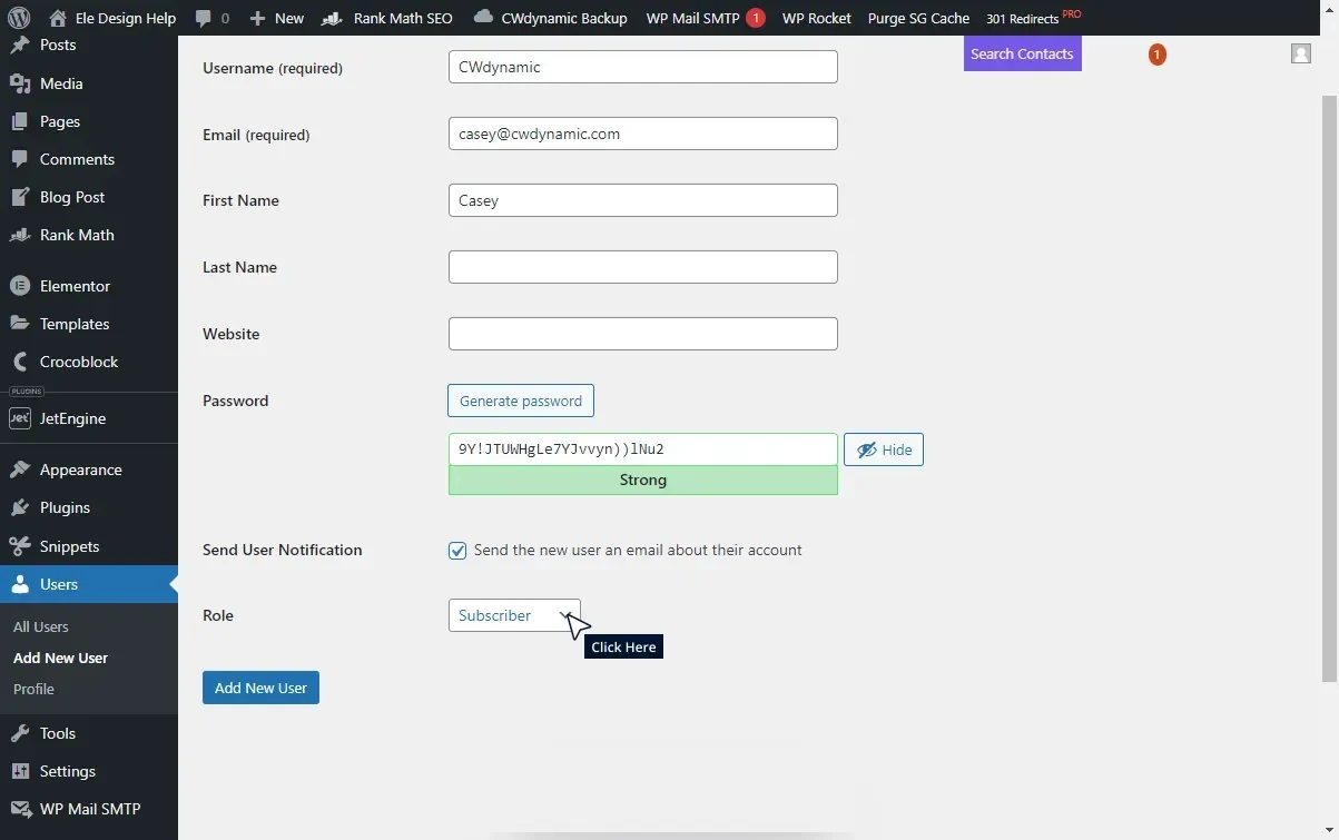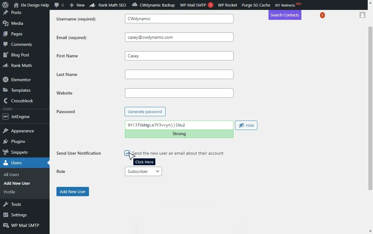 Ensure the “Send the new user an email about their account” message is checked. This way, you don’t have to worry about the password.